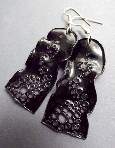 Biżuteria recyklingo wa czyli ażurowe kolczyki z butelek typu PET w kolorze czarnym.