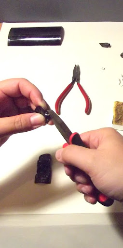 W otworek w zawieszce za pomocą szczypczyk ów wkładamy kółeczko.