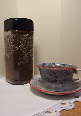 Wzór wymyśliłam prawie sama zainspirowały mnie zdjęcia które znalazłam kiedyś w sieci, przerysowałam do kajetu. Musiały swoje odczekać i jak nabrały "mocy" znalazłam dla nich zastosowanie słoik na kawku.