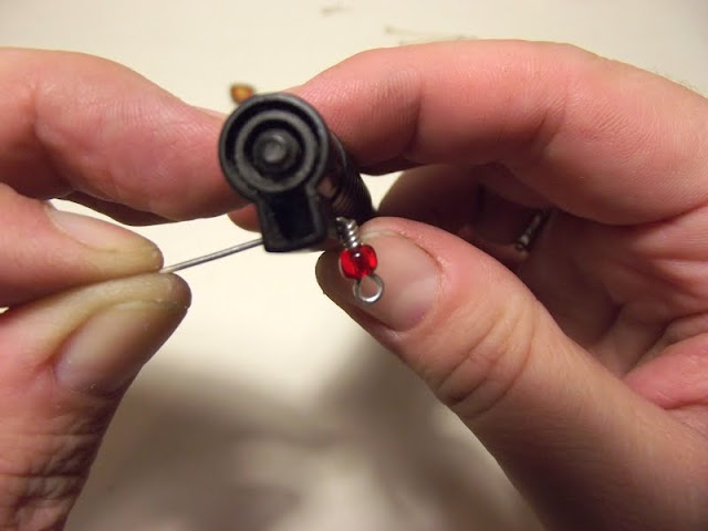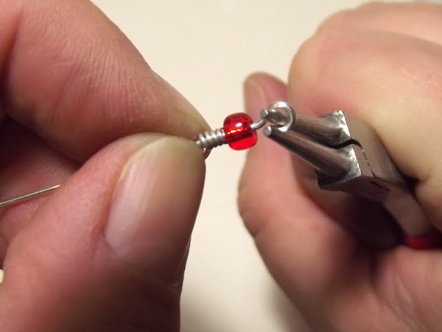 Nakładamy koralik dosuwając go do owijki na wolnym końcu za pomocą okrągłych szczypczyk ów robimy oczko czyli loopik.